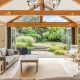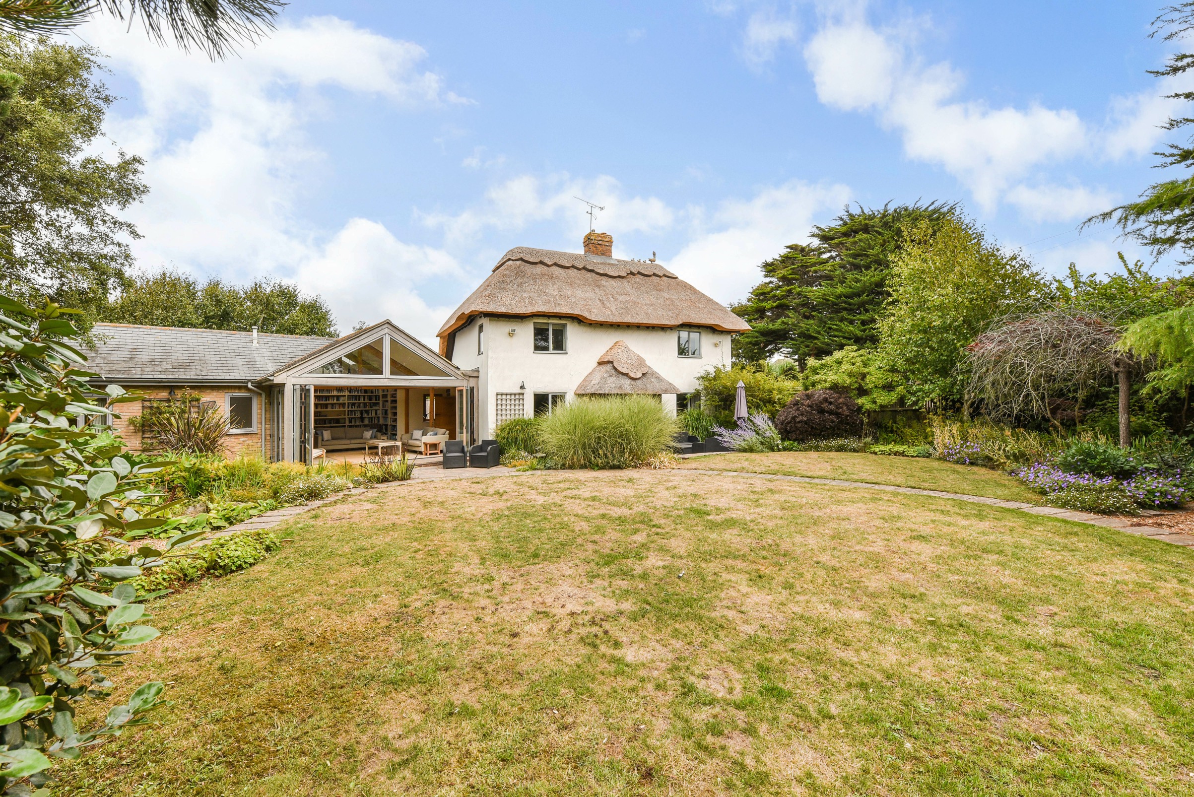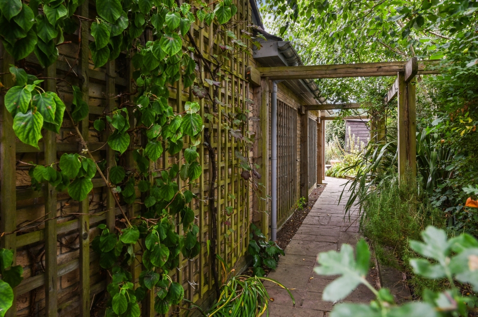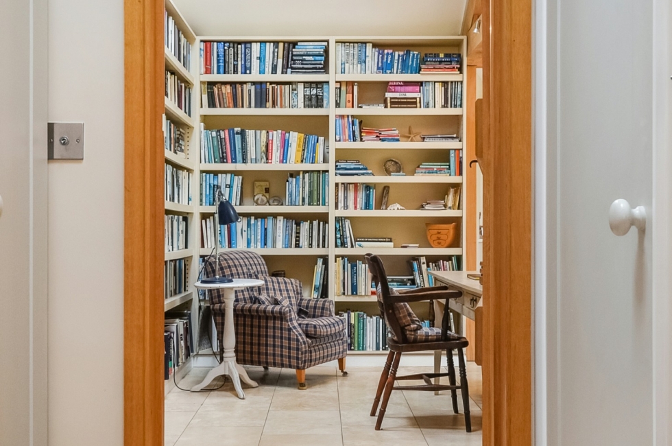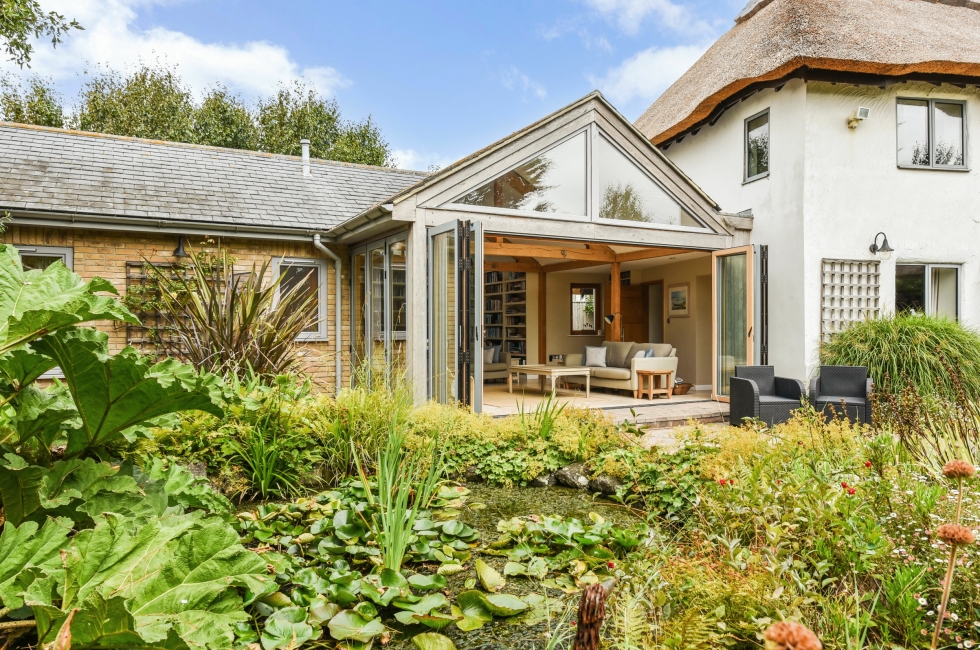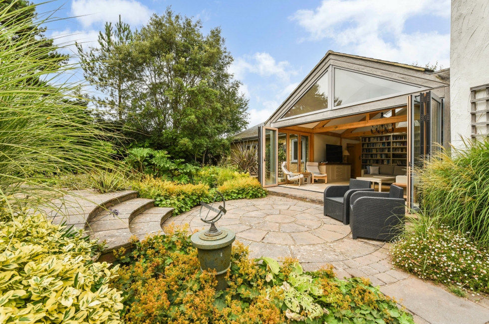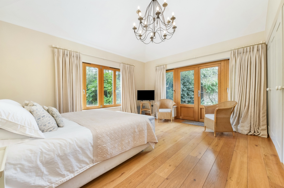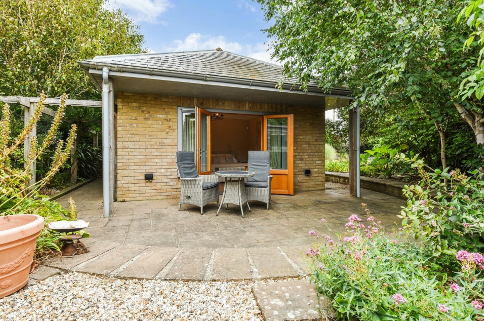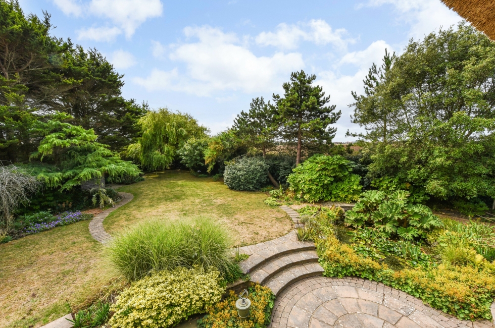 Outside: Enclosed large garden laid to lawn with an open pond. Garden seating for eight with side tables.