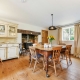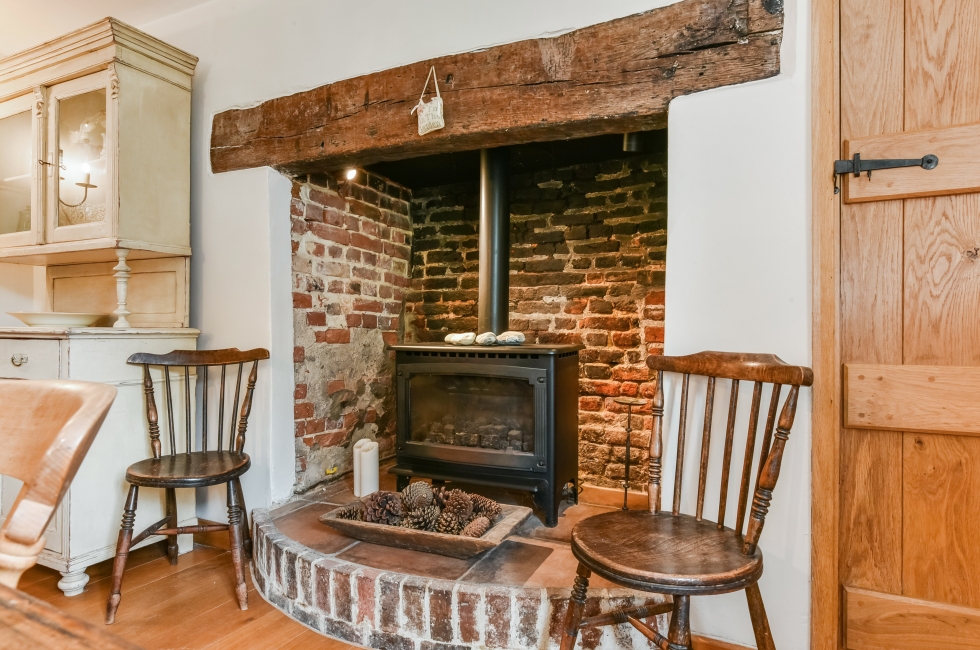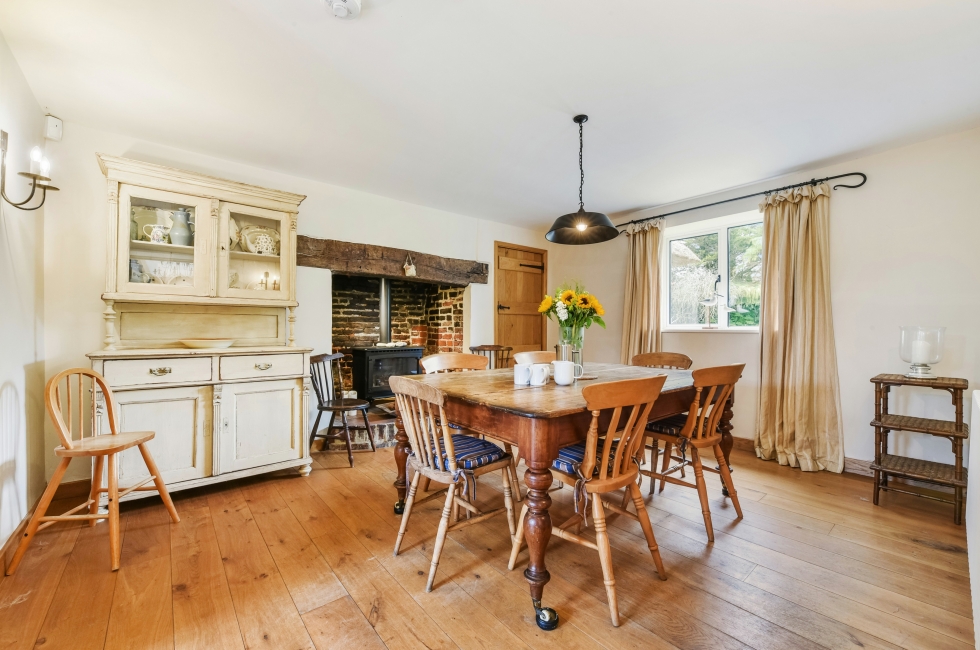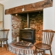 Dining room: Large open fireplace with gas coal fire and large dining room table.