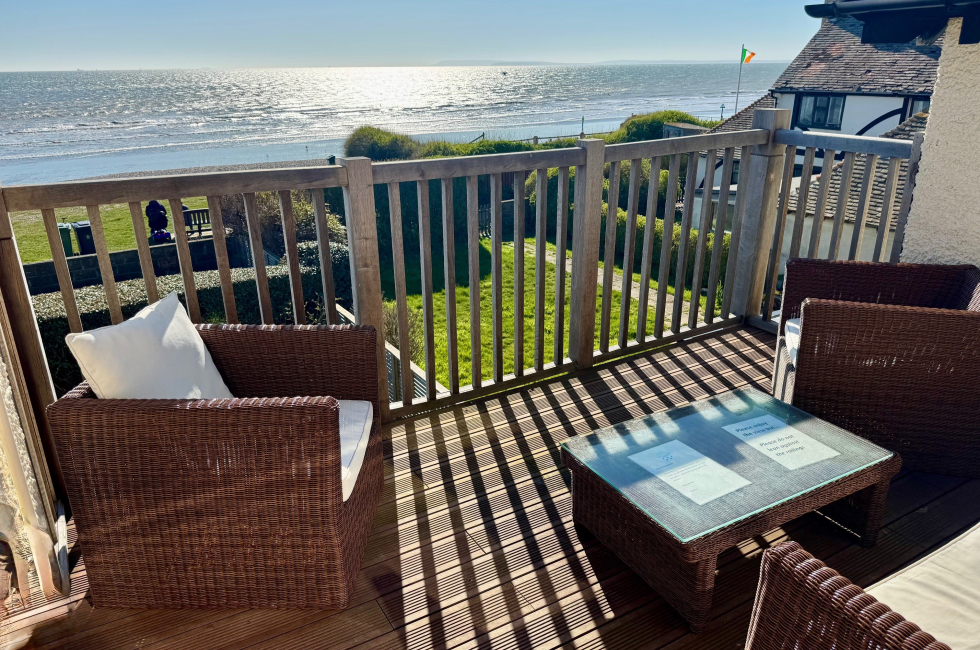Living/dining room with glorious sea views. TV, DVD. Door leading onto the wide south facing balcony with dining furniture.
