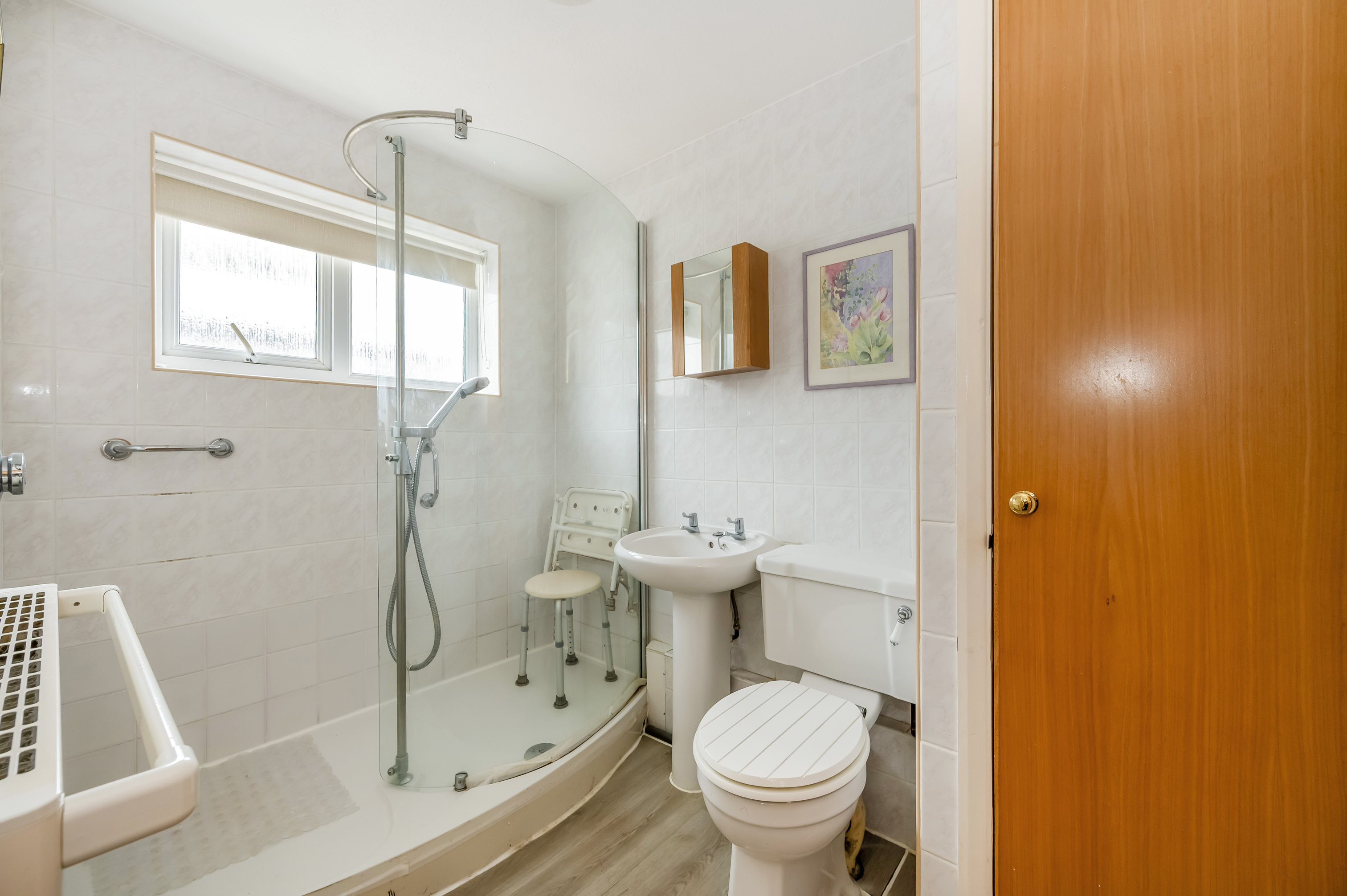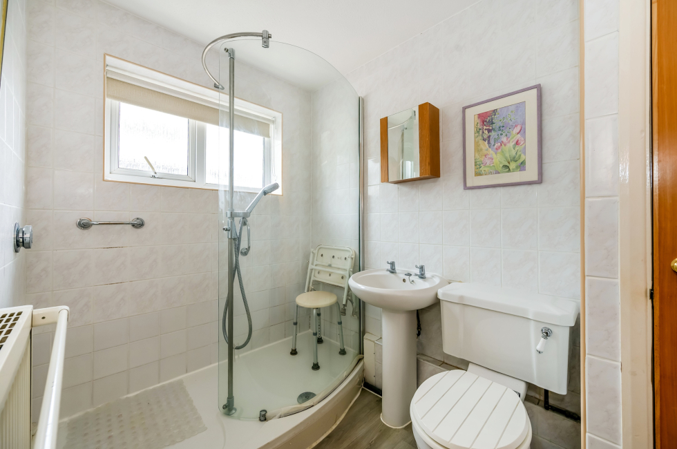Shower Room: Formerly a bathroom. Tiled walls with Full width shower cubicle having mains shower unit, low level w.c and wash hand basin. Radiator. Linen cupboard.