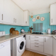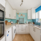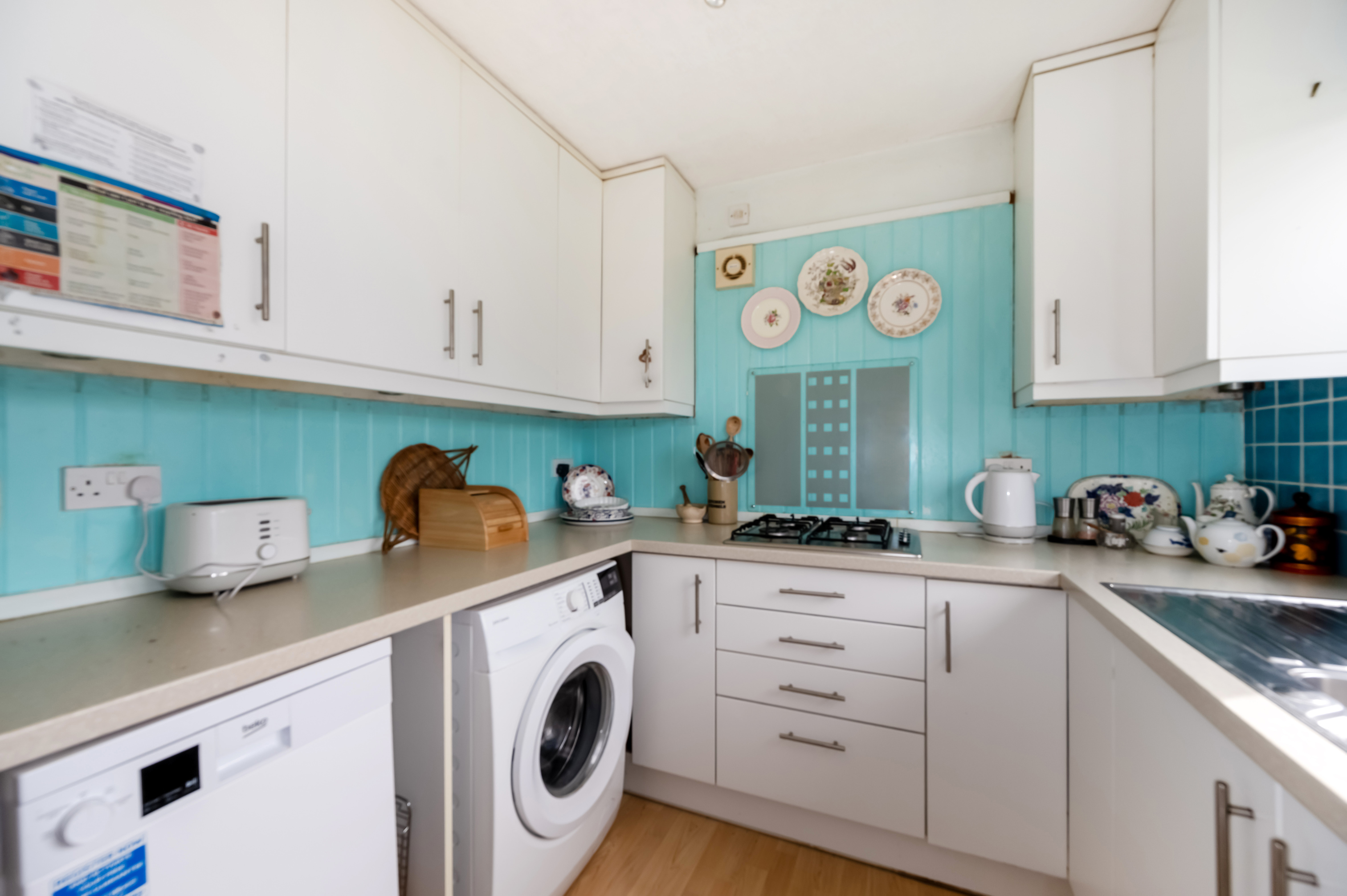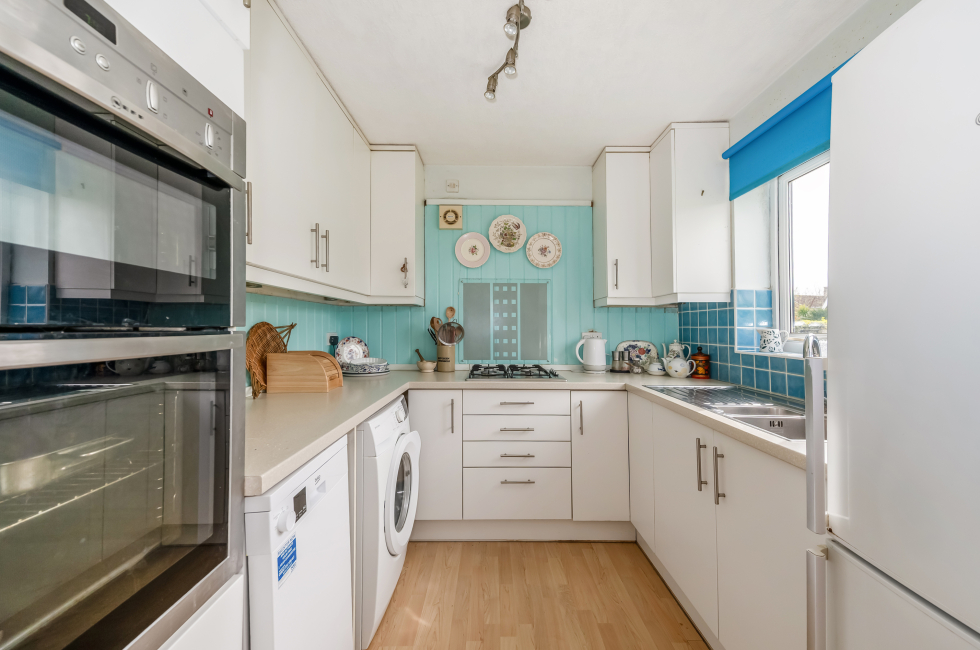 Kitchen: 1.5 bowl inset, stainless steel sink unit. Range of white floor and wall cupboard units. 'Neff' double oven and 'Neff' gas hob. Space and plumbing for washing machine and dishwasher. Space for fridge/freezer. deep storage cupboard.