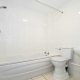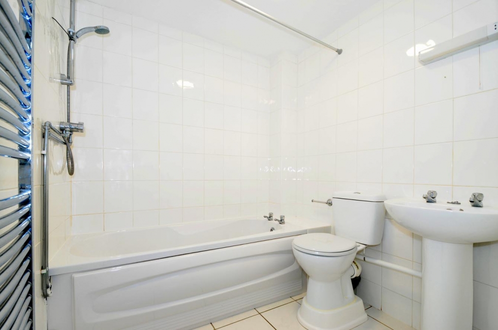 BATHROOM: White suite comprising panelled bath with fitted shower unit, low flush WC and pedestal wash hand basin. Tiled walls. Chrome towel radiator. Ceramic tiled flooring.