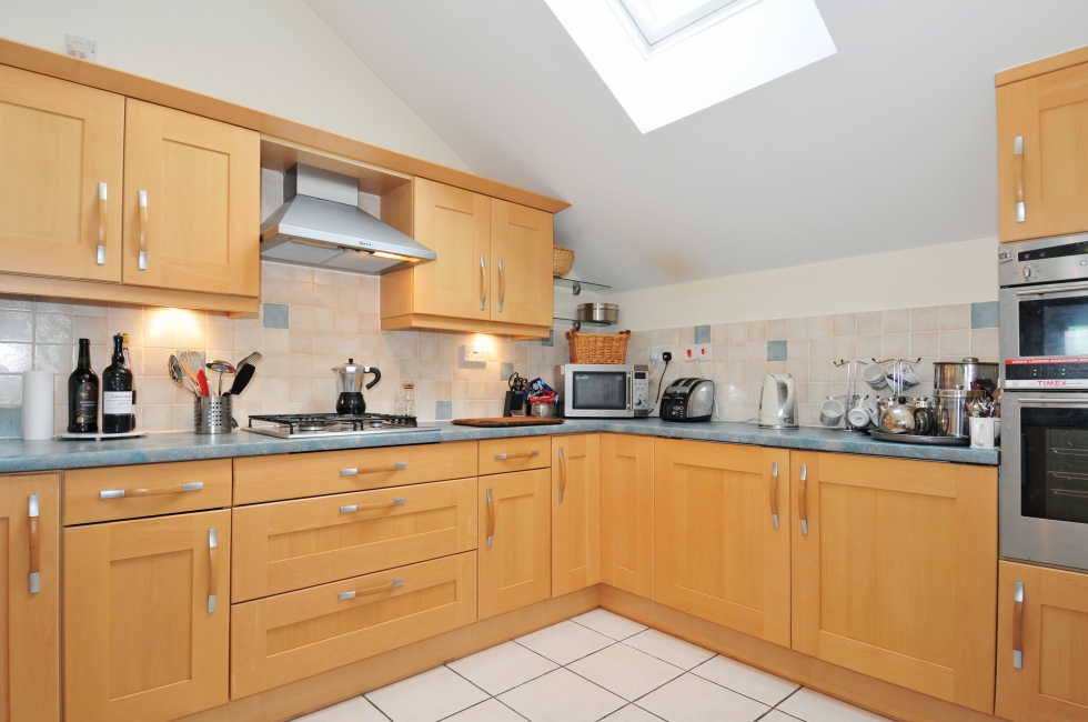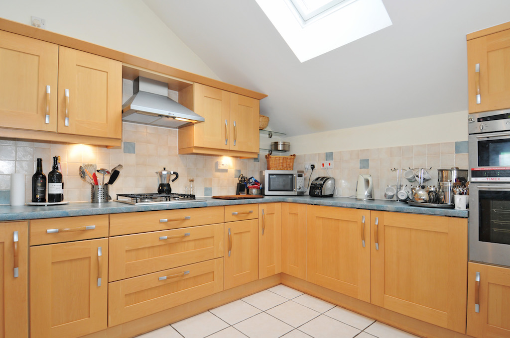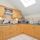 stainless steel hood over, dishwasher, fridge and freezer. Velux skylight window. Recessed lighting above worktops.