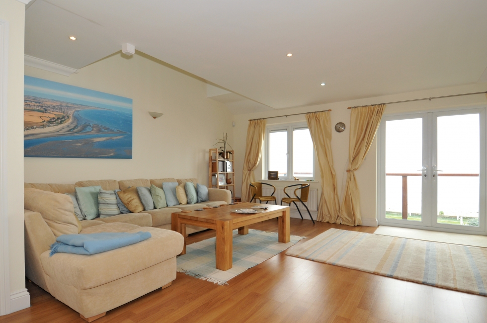 OPEN PLAN SITTING/DINING ROOM: 22'2" x 18'10" (6.76m x 5.74m) (S) Superb panoramic views across The Solent to the Isle of Wight. Double doors opening onto a south facing sun balcony with glass wall. Wood laminate floor. Two wall lights points. Downlighters. Deep storage cupboard. Wide hatch through to Kitchen.