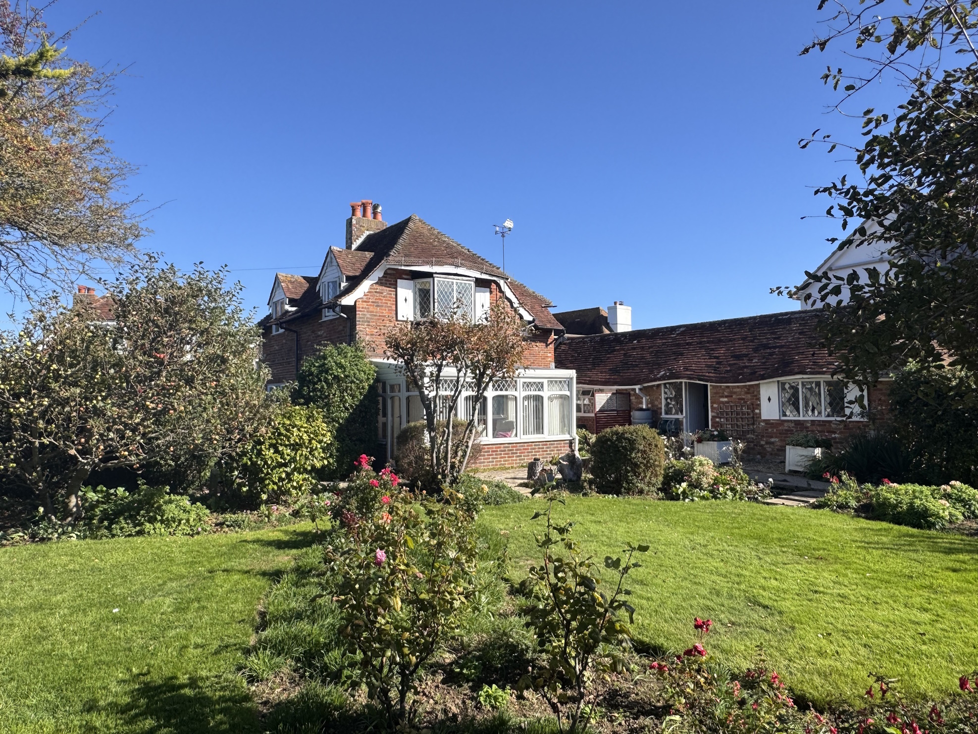 The front garden has a central lawn surrounded by a rose bed and and cottage style borders. There are two apple trees, black current and raspberry bushes. There is a concrete drive with parking for three vehicles. The owners have also for several years, when needed, parked a couple of cars in Barn Road on he Barn Road private estate where it adjoins the boundary with Stocks Cottage.