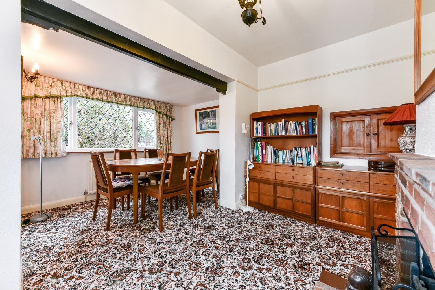 Dining Room: (N and W) Open fire in brick surround and hearth. Serving hatch.