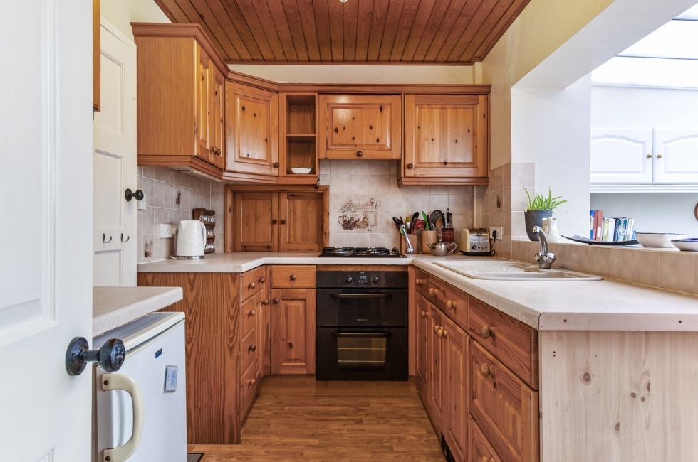 Kitchen: Pine panelled ceiling. Range of solid pine wall and floor units with 1 and half bowl inset sink unit. 'Ariston' gas hob and 'Creda' built in electric oven. Space for fridge. Opening through into Breakfast Room.